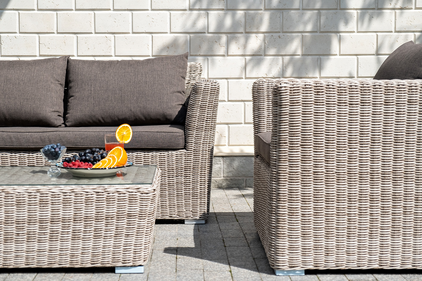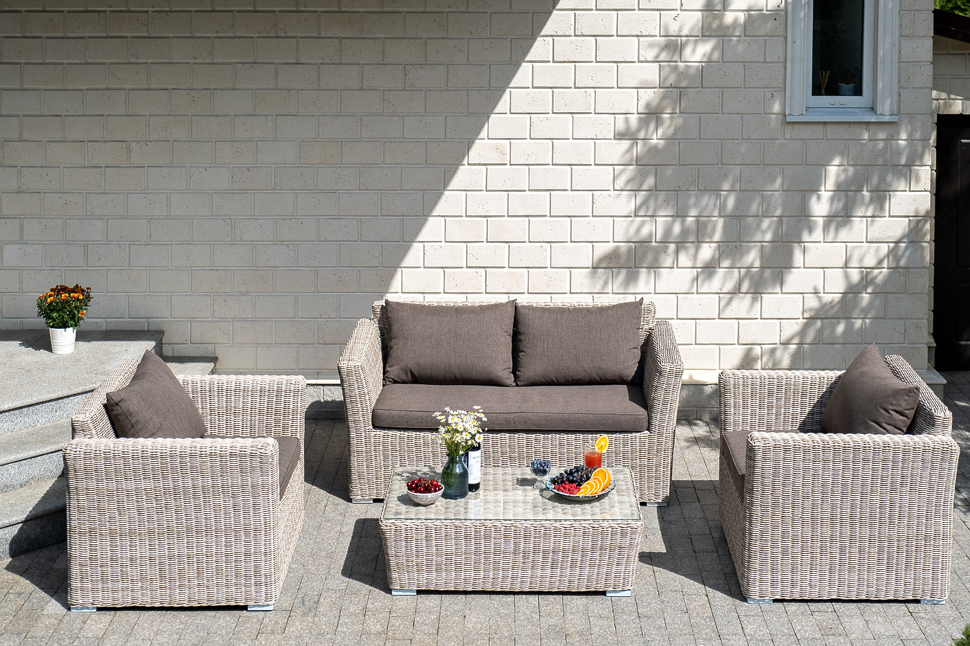 Лаунж-зона «Капучино Сингл» на 4 персоны. Она включает в свой состав: - двухместный диван (размер – 1700×865×815 мм). - два кресла (размер – 1040×865×815 мм). - плетеный журнальный столик (размер – 1100×660×340 мм). Прочный алюминиевый каркас усиливает устойчивость мебели. Его дополняет бежевая оплетка, которая представлена из круглого искусственного ротанга. Более комфортной лаунж-зону делают мягкие подушки с чехлами из серого полиэстера. Его плотность находится в рамках 300гр/м2. Ткань предварительно обрабатывается влагоотталкивающими составами. Параметры дивана и двух кресел без подушек: Глубина сидения – 630 мм; Высота сидения – 370 мм; Высота спинки – 470 мм. Столешница журнального столика также входит в комплект и поставляется в собранном виде с самим столиком. Она изготовлена из закаленного стекла – 5 мм. "Капучино" диван из искусственного ротанга двухместный, цвет бежевый 1шт. 1 700Х865Х815, "Капучино" кресло из искусственного ротанга, цвет бежевый 2шт. 1 040Х865Х815, "Капучино" журнальный столик из искусственного ротанга, цвет бежевый 1шт. 1 100Х660Х340,