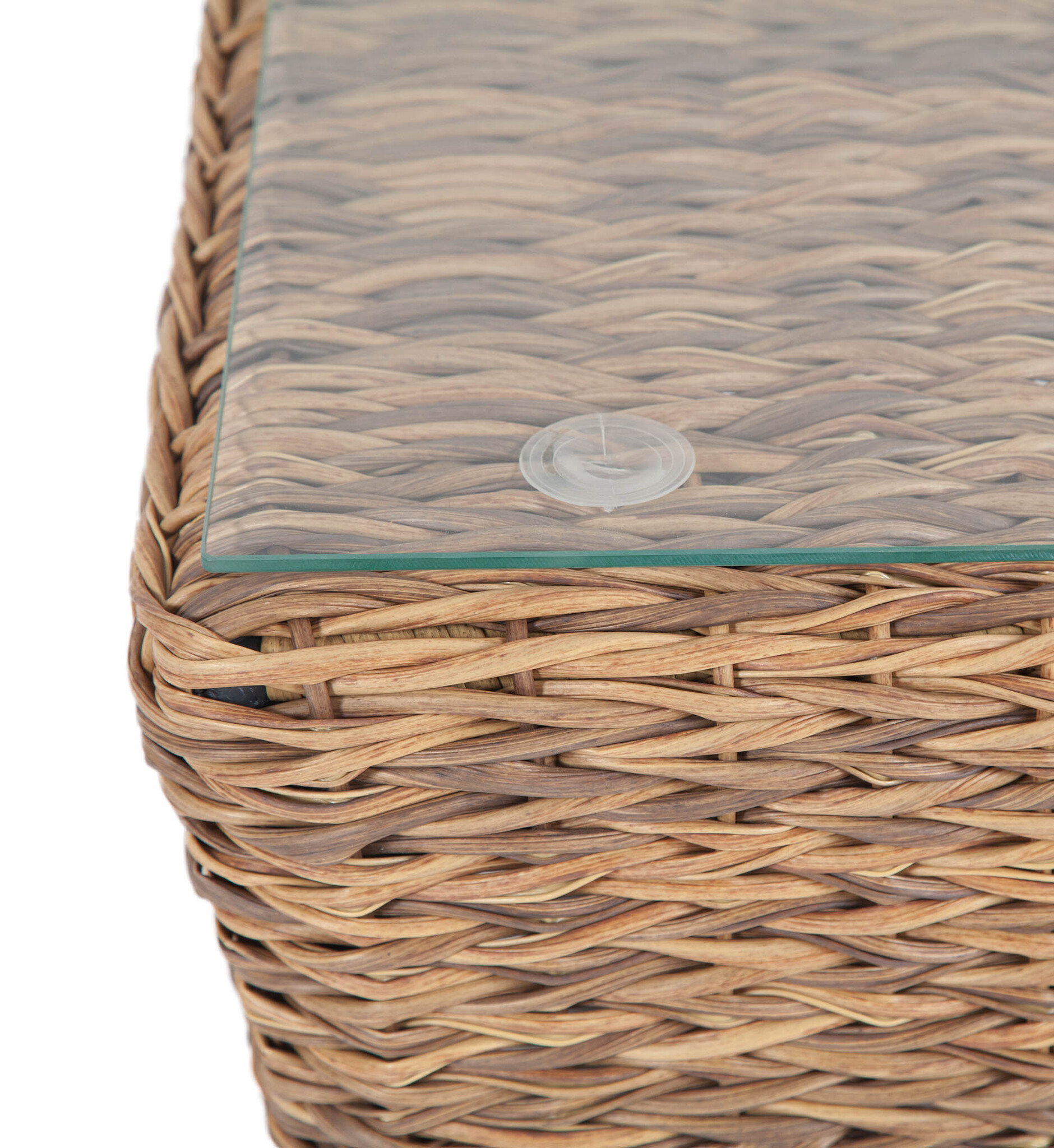 Журнальный столик «Капучино» является хорошей парой к трехместному дивану, который представлен в этой мебельной коллекции. Размер модели – 1100×660×340 мм. Устойчивость и прочность ей придает каркас, выполненный из высококачественного алюминия. Каркас оплетен вручную с помощью искусственного ротанга вида "гиацинт". Мебель выполнена в соломенном цвете. На поверхности столика прочно закреплена столешница из прозрачного стекла, что позволяет транспортировать мебель в собранном виде. Столик дополнен пластиковыми ножками для лучшей устойчивости.