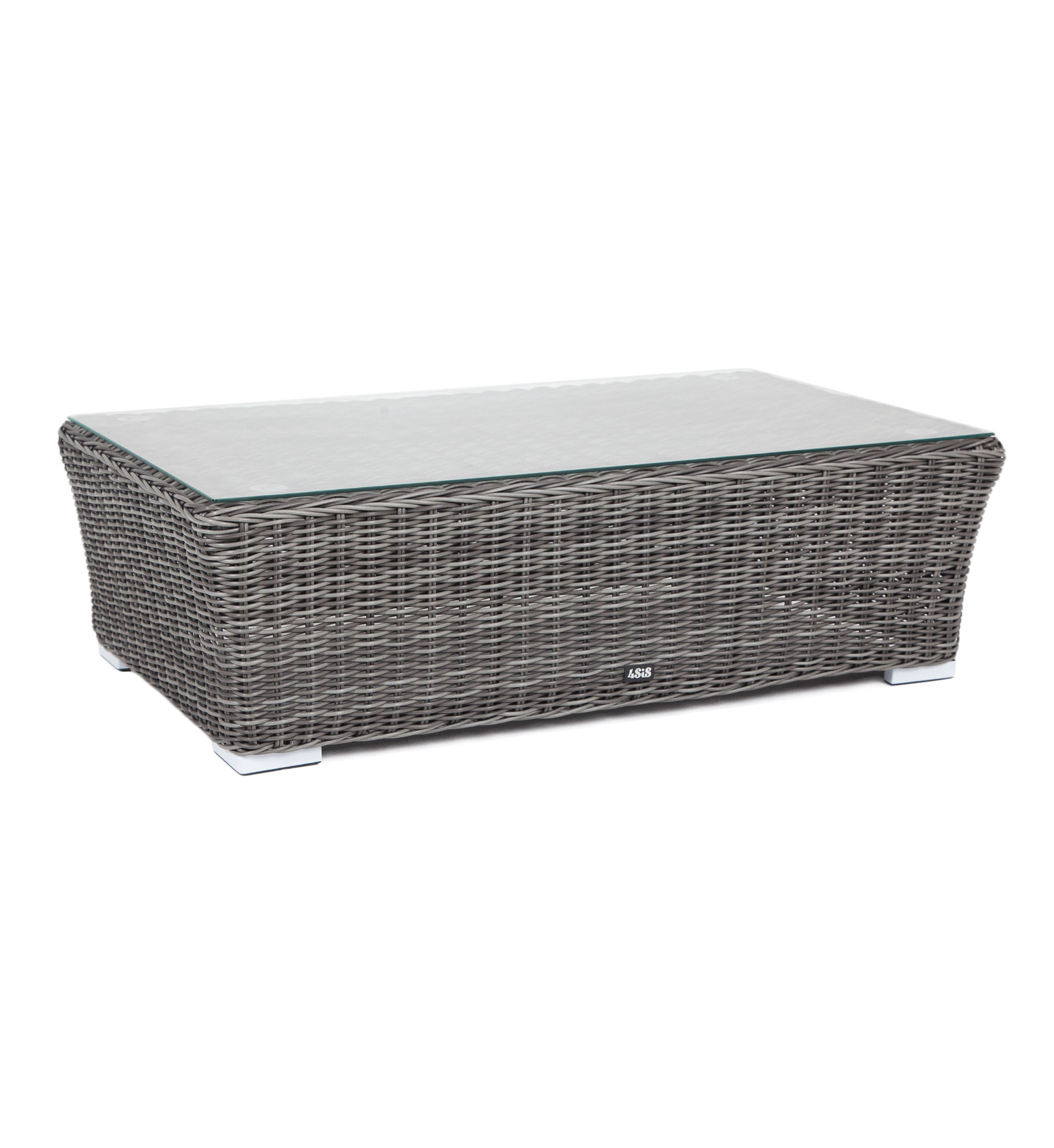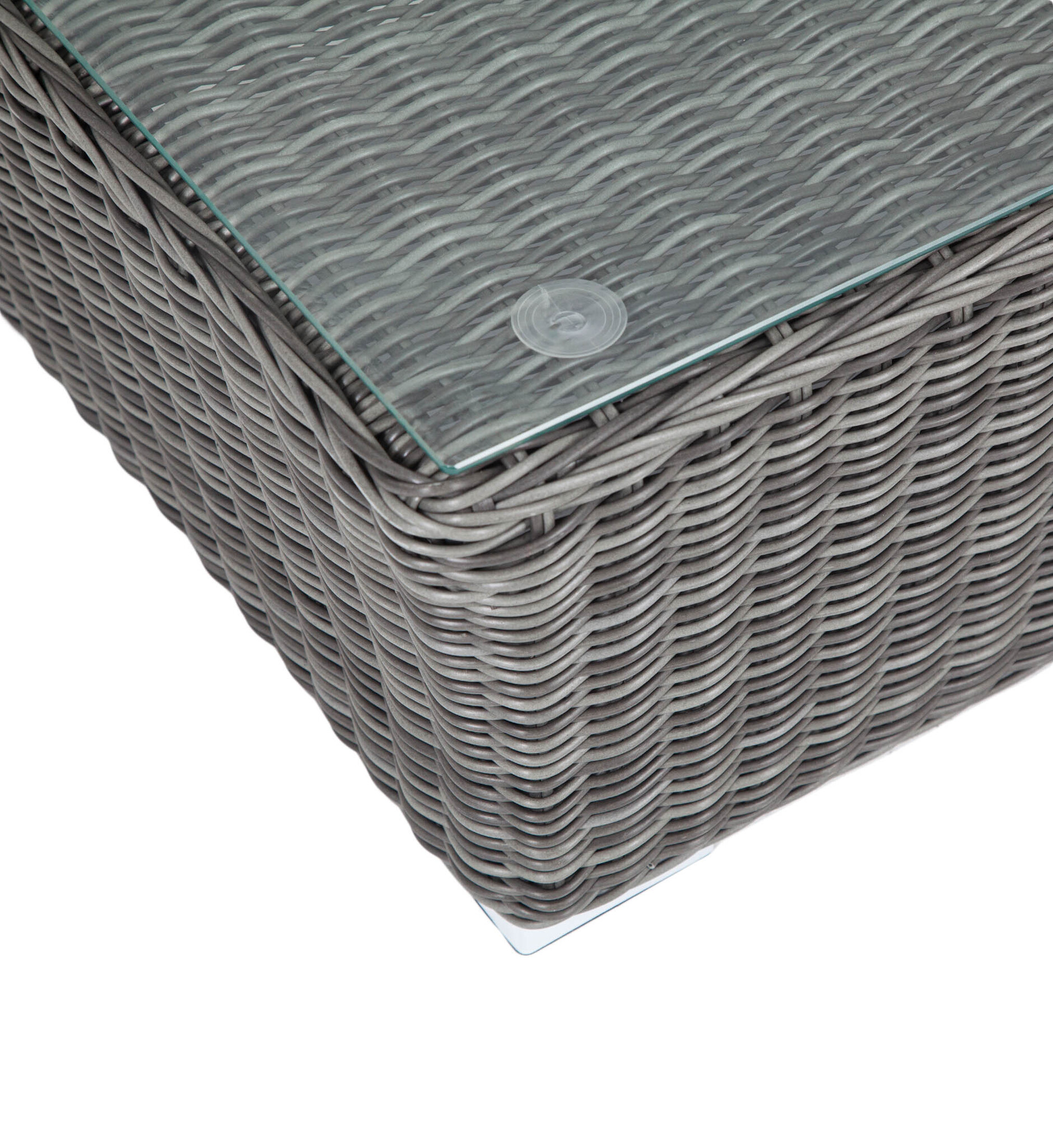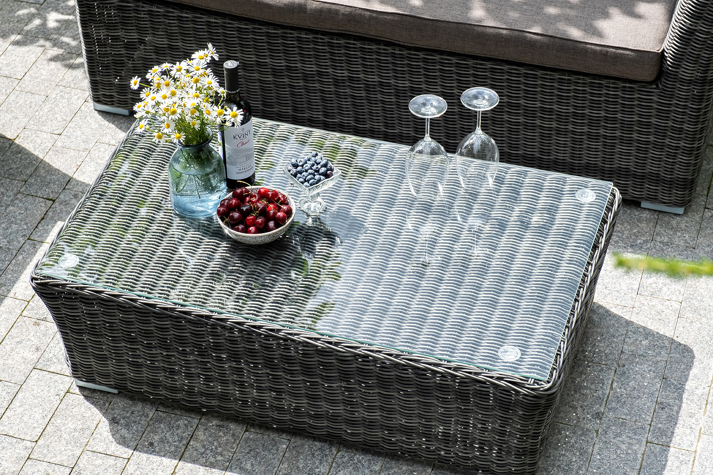 Журнальный столик из искусственного ротанга «Капучино» графитового оттенка обладает прочным каркасом, изготовленным из алюминия, оплетка которого произведена ручным способом. Поверхность защищена столешницей из 5 мм стекла. Размеры модели: 1100×660×340 мм.