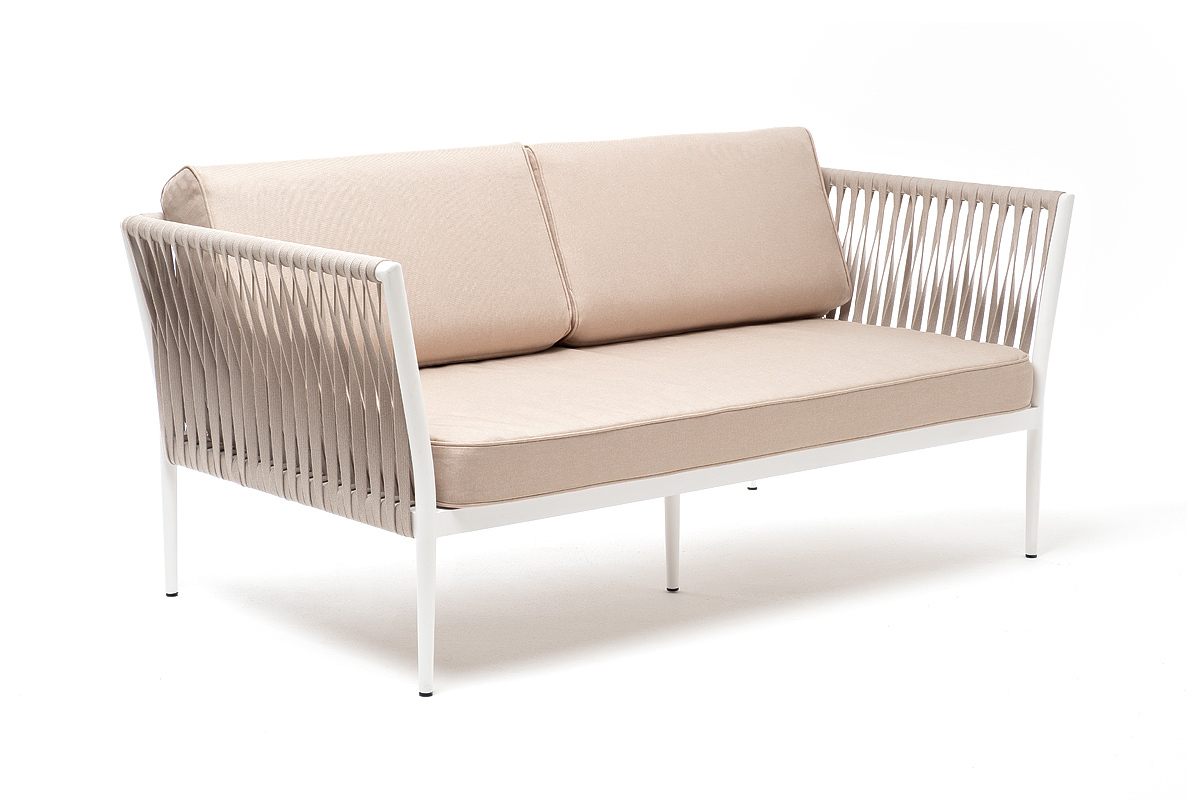 "Касабланка" диван 2-местный плетеный из роупа, каркас алюминий светло-серый (RAL7035) муар, роуп серо-коричневый 23мм, ткань бежевая 052