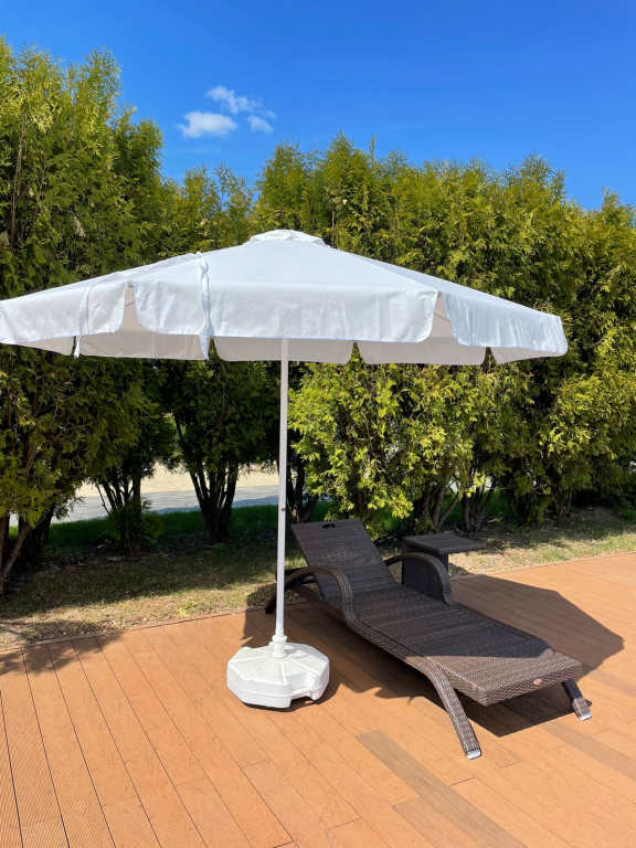 Kiwi Clips- профессиональный зонт с центральной опорой из алюминия, что обеспечивает высокую устойчивость модели. Он защитит от ярких солнечных лучей и создаст приятную затененную атмосферу в частных садах, открытых летних площадках кафе, баров и ресторанов, зоны возле бассейна. Это больше, чем зонт, с его эстетичным и стильным внешним видом, простотой открытия и закрытия, долговечностью и дополнительными функциями, такими как журнальный столик и пепельница. Система зажимов, используемая зонте Kiwi Clips, работает по логике, аналогичной ручным зонтам. В отличие от ручных зонтов, сила, используемая для открывания и закрывания, исходит от натяжения ткани зонта. Нажимая пластиковый корпус вверх, зонт открывается. После прохождения определенного места гибкость ткани берет на себя силу, приложенную к пластиковому корпусу, и зонт остается полностью раскрытым и зафиксированным. Если опустить пластиковый корпус, и зонт закроется. Особенности: Открывается легким движением руки, с плавным ходом и надежной фиксацией. Центральная опора Ø35 мм, столщинойметалла 2 мм, выполнена из алюминия.Алюминий окрашен и прошел специальную термообработку, которая повышаетпрочность и коррозионную стойкость зонта. 8 спиц 12х18,с толщиной металла 1 мм, выполнены из алюминия. Высота зонта2100 мм , в открытом виде до спиц - 1800 мм. Детали выполнены из цельного пластика. Купол с воланом выполнен из ткани олефинбелого цвета. Покрытие опоры и спиц белого цвета. Возможно выполнение зонта с наклонным механизмом, +20% к стоимости изделия. Дополнительно можно приобрести утяжелительнуюбазувесом 50 кг. Цена на сайте указана за модель с белым каркасом и куполом из белого олефина. Цены на другие модели Вы можете уточнить у менеджеров.
