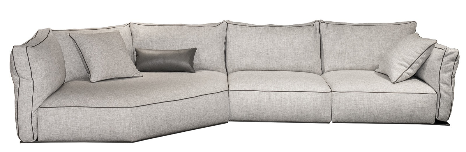 Модульный комплект Eliote, состоящий из трёх элементов: модуль-трапеция, кресельный нейтральный модуль, кресельный модуль с левым подлокотником. Мягкие части — ткань рогожка Norton SER (коллекция Garda Decor), каркасные части — искусственная кожа Magic16. В комплекте 3 декоративные подушки: одна прямоугольная (64×30 см) в искусственной коже, две квадратные (60×60 см) с кантом из кожи. Высота посадочного места — 36 см, глубина сиденья — 76 см.