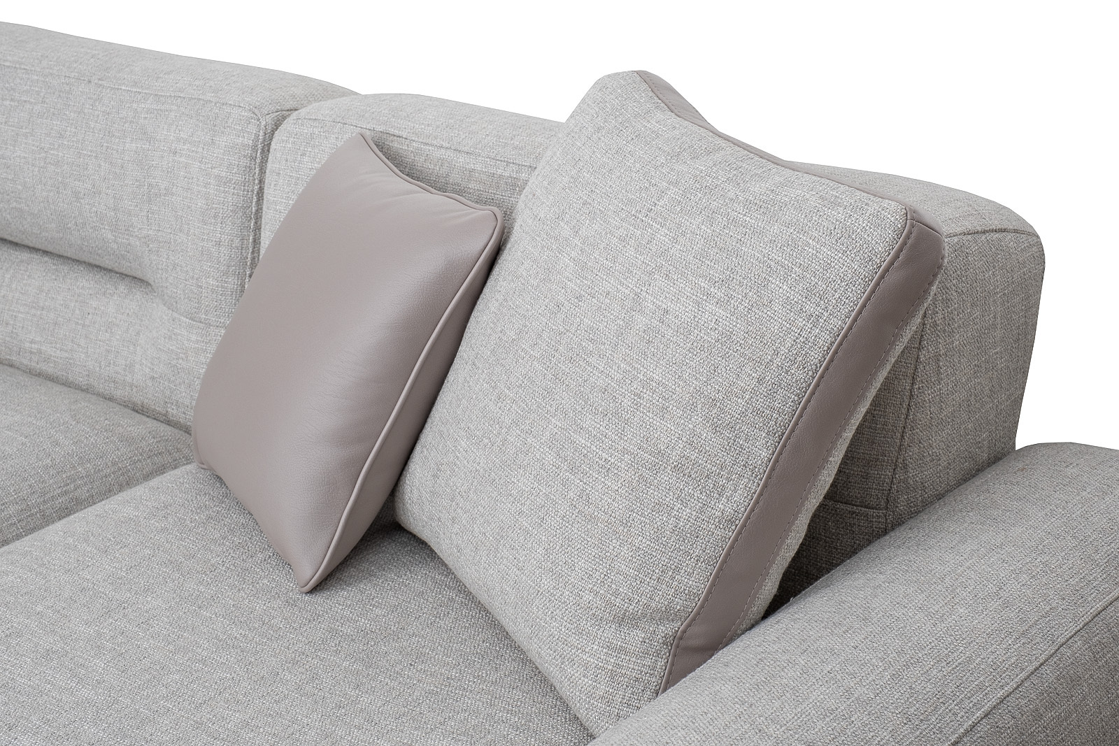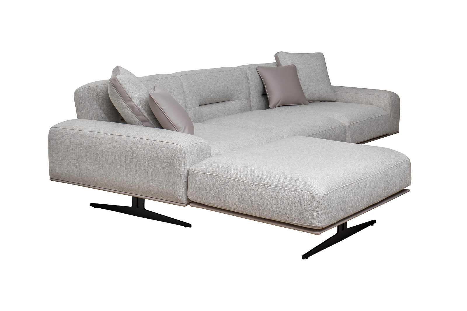 Комплект мебели №11 диван модульный PORTO (левый угол). В состав комплекта входит: основание трехместное-1шт, выполнена в иск.коже Enzo902; подлокотник низкий-2шт; сиденье с высокой спинкой-3шт; отдельностоящий пуф- 1шт. Основная ткань комплекта- рогожка Norton SER из коллекции тканей Garda Decor. В сотав комплекта входят декоративные подушки: 50*50см с бурлетом 2шт- в ткани Norton SER. бурлет- иск.кожа Enzo902; 40*40см с кантом 2шт- в иск.коже Enzo 902. Металлические опоры- 170см, цвет черный. Габариты комплекта: ширина-294см, глубина- 194см, высота-75см. Глубина пуфа- 107см, глубина посадочного места- 82см, высота посадочного места- 45см