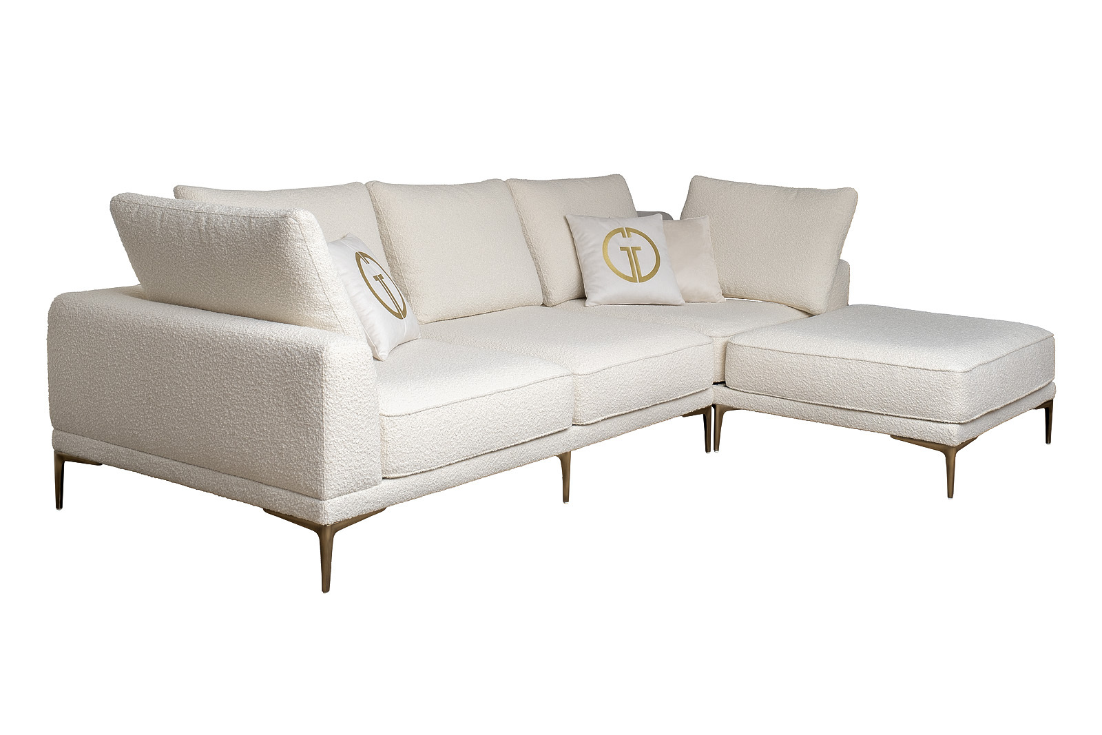 Комплект мебели №52 модульный Диван Tesoro (правый угол). В состав комплекта входит: модуль угловой левый DL-1шт, модуль угловой правый KR+P- 1шт. Комплект выполнен в ткани из коллекции Garda Decor- букле Orso Ecru. В состав комплекта входят декоративные подушки: 45*45см в ткани Atmosphera 010-2шт, 45*45см в ткани Atmosphera 000-2шт с вышивкой эмблема GD в цвет золото. Металлические опоры 18см, цвет бронза. Габариты комплекта: ширина- 3100мм, глубина-2000мм, высота- 900мм. Глубина сиденья- 750мм, высота посадочного места- 440мм.