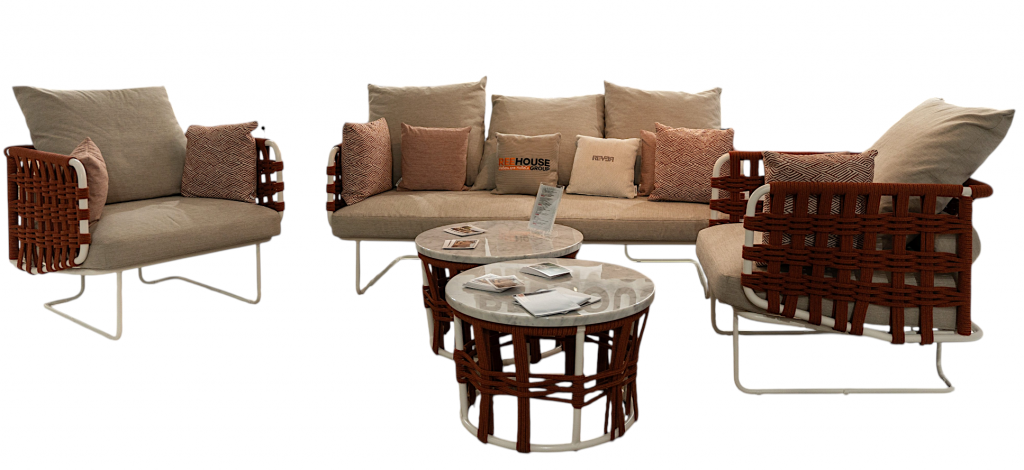 Дизайнерский лаунж-комплект Nido от Marco Piva (фабрика Rever, Италия). Каркас из лакированной нержавеющей стали, плетение из плоского полипропиленового каната (роуп). В составе: 2 кресла, 1 диван, 2 кофейных столика с мраморными столешницами Marmo Carrara. Подушки на инновационном наполнителе Tecnorev (дифференцированная плотность, воздухопроницаемость, антибактериальные свойства). Обивка — 100% полиэстер. В комплекте 6 декоративных подушек. Подходит для террас, отелей, крупных заведений.