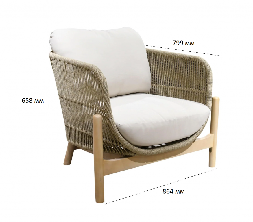 Каркас кресла выполнен из алюминия. Деревянные элементы из массива акации с отделкой экомаслом. Плетение из роупа бежевого цвета. Подушки из ткани олефин цвета лен с наполнителем из толстого поролона. Фурнитура из анодированной нержавеющей стали.