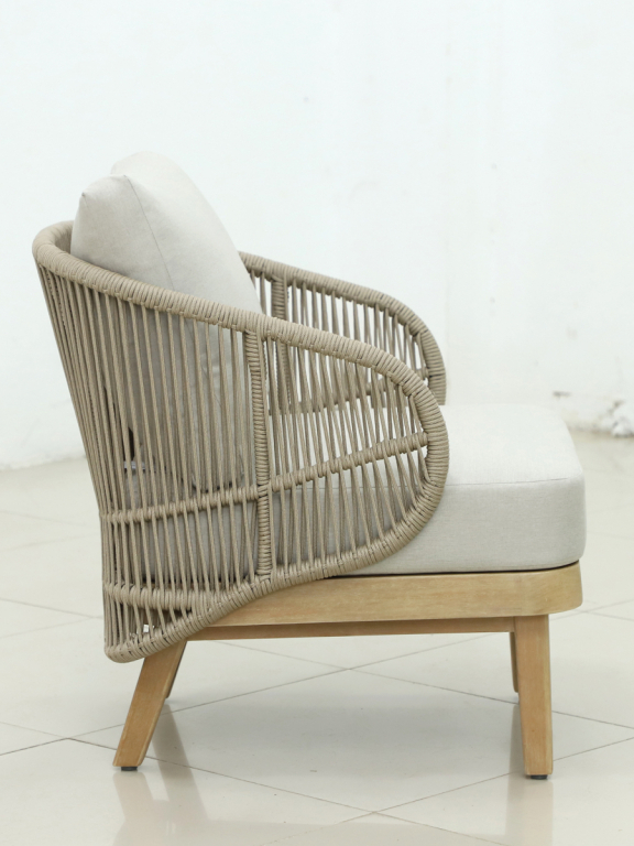 Эксклюзивная коллекция Mali приглашает вас окунуться в стиль и безмятежность на открытом воздухе. Кресла, вдохновленные побережьем, имеют прочный алюминиевый каркас, оплетенный роупом, очаровательные ножки из эвкалипта и мягкие, удобные подушки, предназначенные для круглогодичного отдыха на открытом воздухе и развлечений. Особенности: Материал - ЭВКАЛИПТ, отделка экомаслом тик Light #01A. Древесина, из которой изготовлена мебель, имеет сертификацию FSC (Forest Stewardship Council) - гарантия качества и происхождения древесины. Знак FSC - показатель того, что продукция происходит из леса, в котором ведется экологически и социально ответственное лесное хозяйство. Благодаря своей долговечности, прочности и устойчивости к вредителям эта древесина была создана для изготовления садовой мебели. Страна происхождения древесины: Уругвай. Средняя плотность древесины: 550-600 кг/м3. Плетение выполнено из роупа VPR - PR559. Подушки в комплекте, ткань подушек - полиэстер SK222. Материалы устойчивы к УФ-излучению и другим погодным воздействиям. Наполнение подушек - формованный пенополиуретан (foam) - этот материал очень мягкий и комфортный, быстро быстро восстанавливает первоначальную форму. Открыть инструкцию по уходу. Вся деревянная мебель должна обрабатываться специальным маслом или пропиткой минимум 1 раз в 6 месяцев (в условиях высокой влажности обработку следует проводить чаще). Для данной мебели не рекомендуются резкие температурные перепады. Дерево является натуральным материалом, поэтому любые трещины, неравномерные природные рисунки, различность оттенков ‐ являются естественным процессом, который вызван температурными изменениями или влажностью.