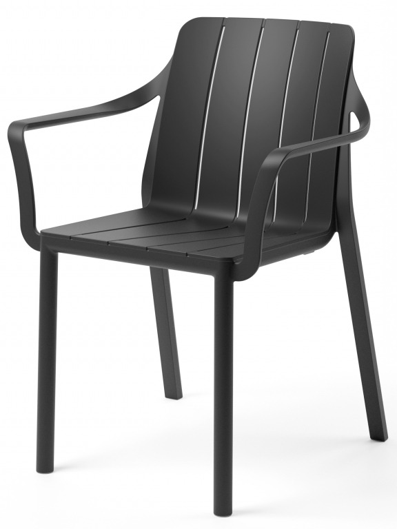 Дизайнерское кресло Tiberina от Raffaello Galiotto (Nardi). Материал — стеклопластик (полипропилен, армированный стекловолокном) с добавлением 30% переработанного сырья. Матовая чёрная поверхность, плавные линии, лёгкая штабелируемость. Устойчиво к УФ и осадкам. Производство — Италия.