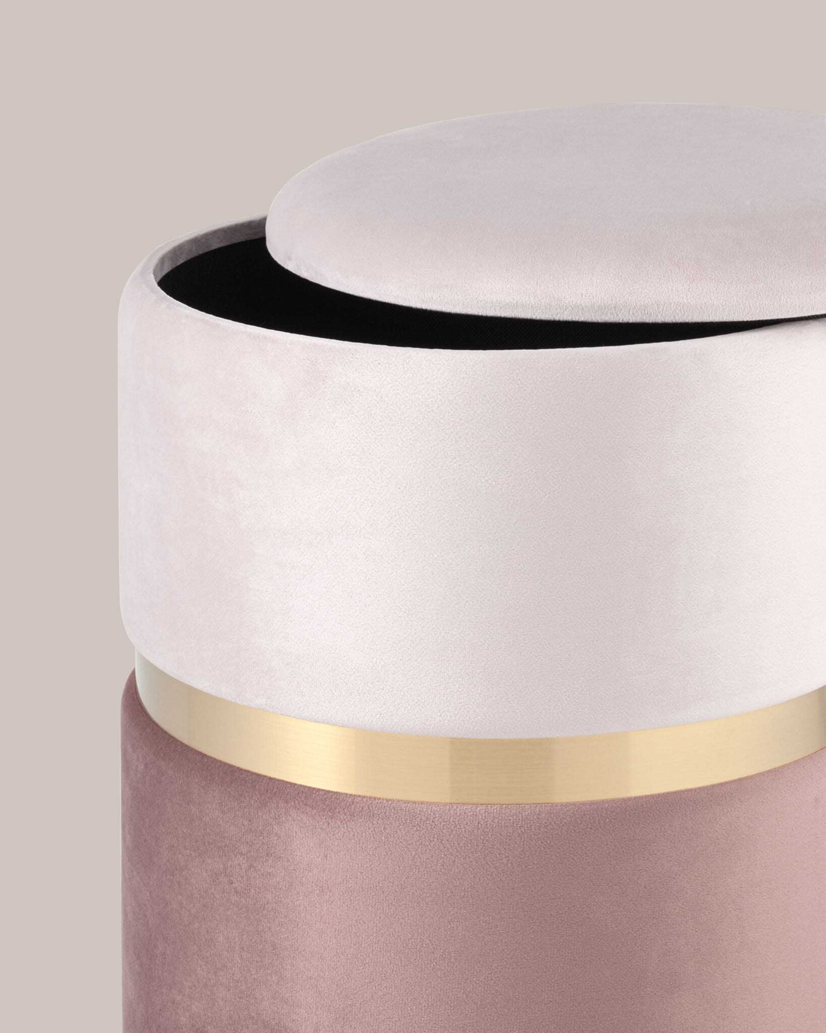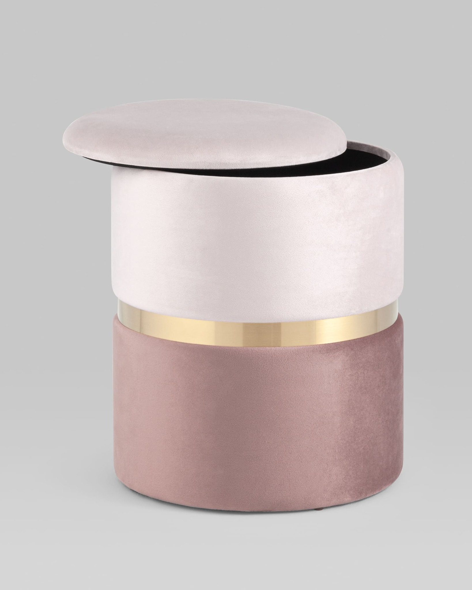 Лаконичная модель пуфа в мягкой обивке прекрасно впишется в современные интерьеры. Обивка выполнена из велюра в светлом и темном оттенках и украшена металлическим ободком в золотом цвете. Под сиденьем имеется ящик для хранения различных мелочей. В основании предусмотрены специальные подпятники, которые делают пуф более устойчивым и предотвращают скольжение.