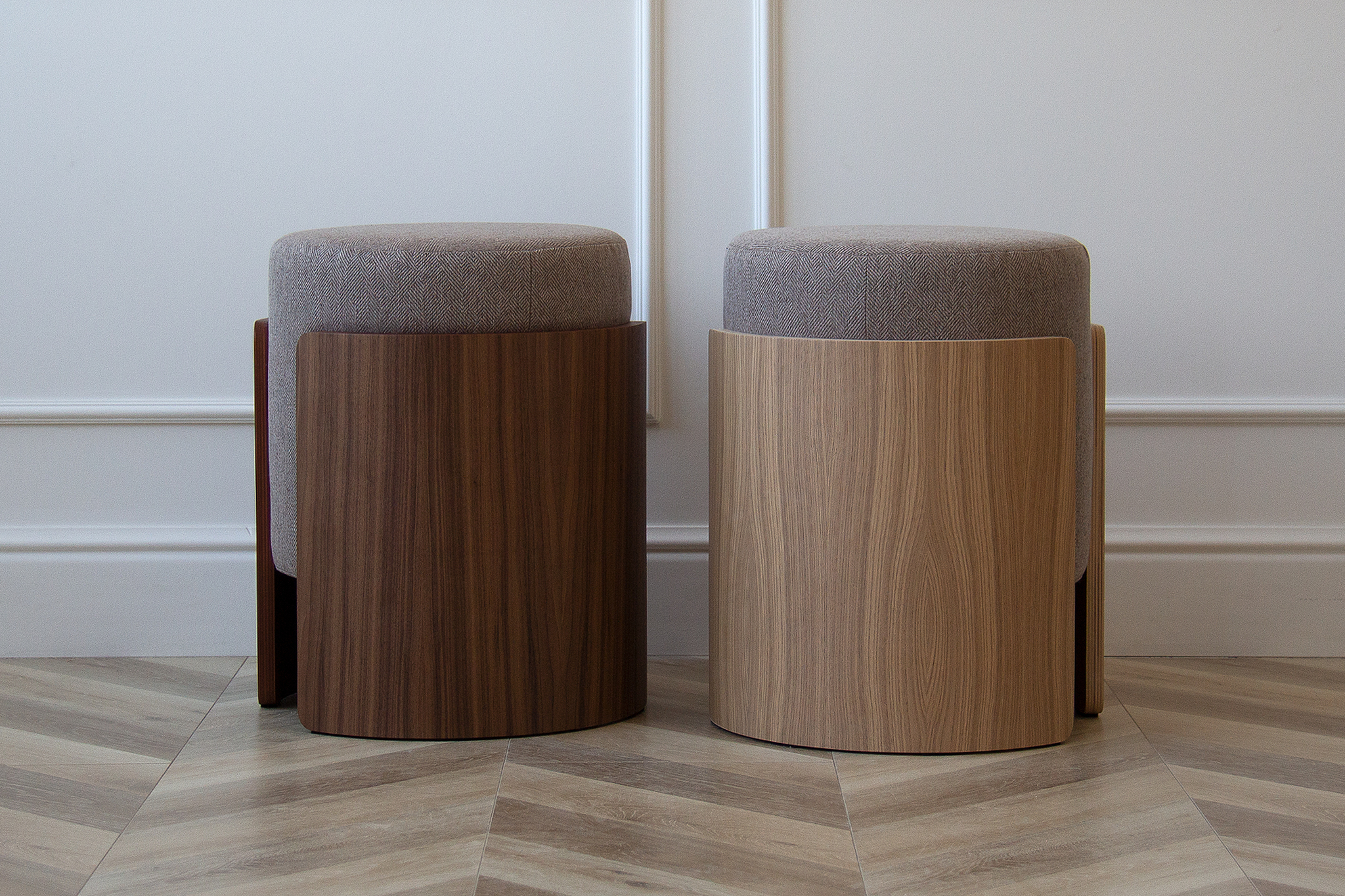 Комфортный мягкий пуф дополнит интерьер гостиной, спальни или прихожей Каркас: фанера, шпон ореха Обивка: ткань твид Габариты: d 39 см, высота 44 см Вес: 9 кг