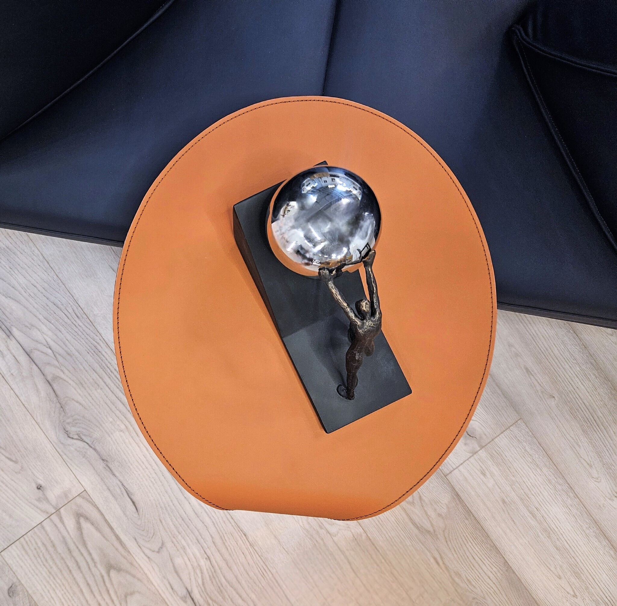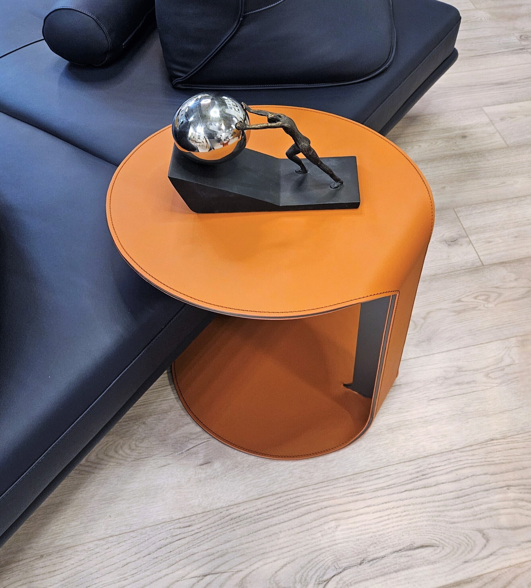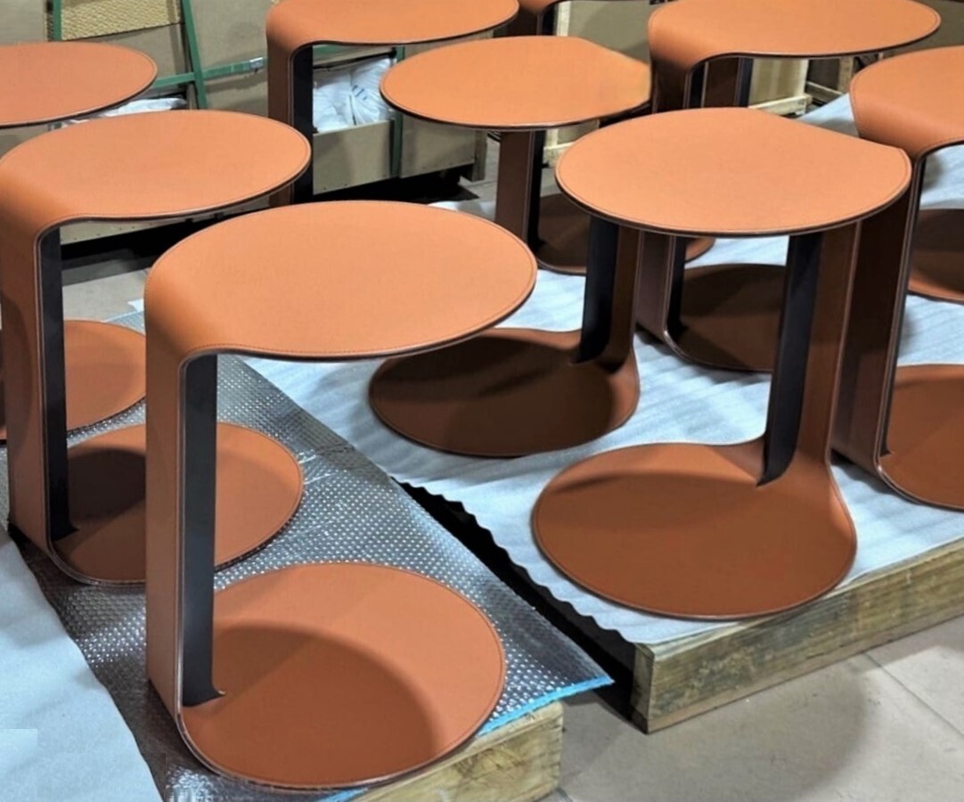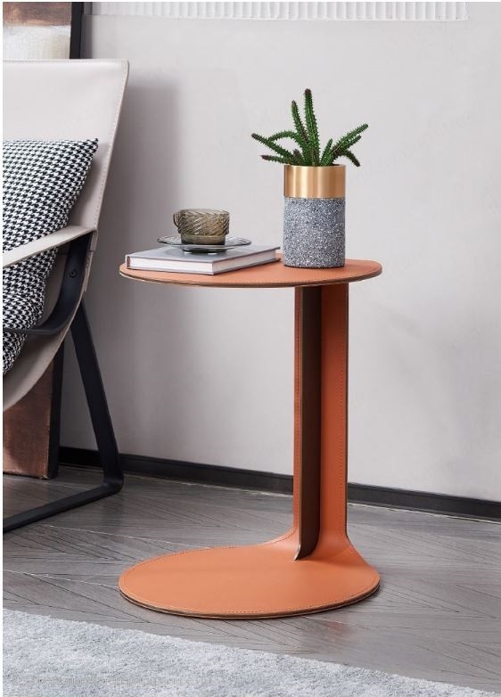 Основание выполнено из стали. Столешница: экокожа, металл. Цвет в наличии охра (рыжий). Поставляется в собранном виде.Размеры упаковка, Д*Ш*В:50*50*54 см, вес 12 кг.