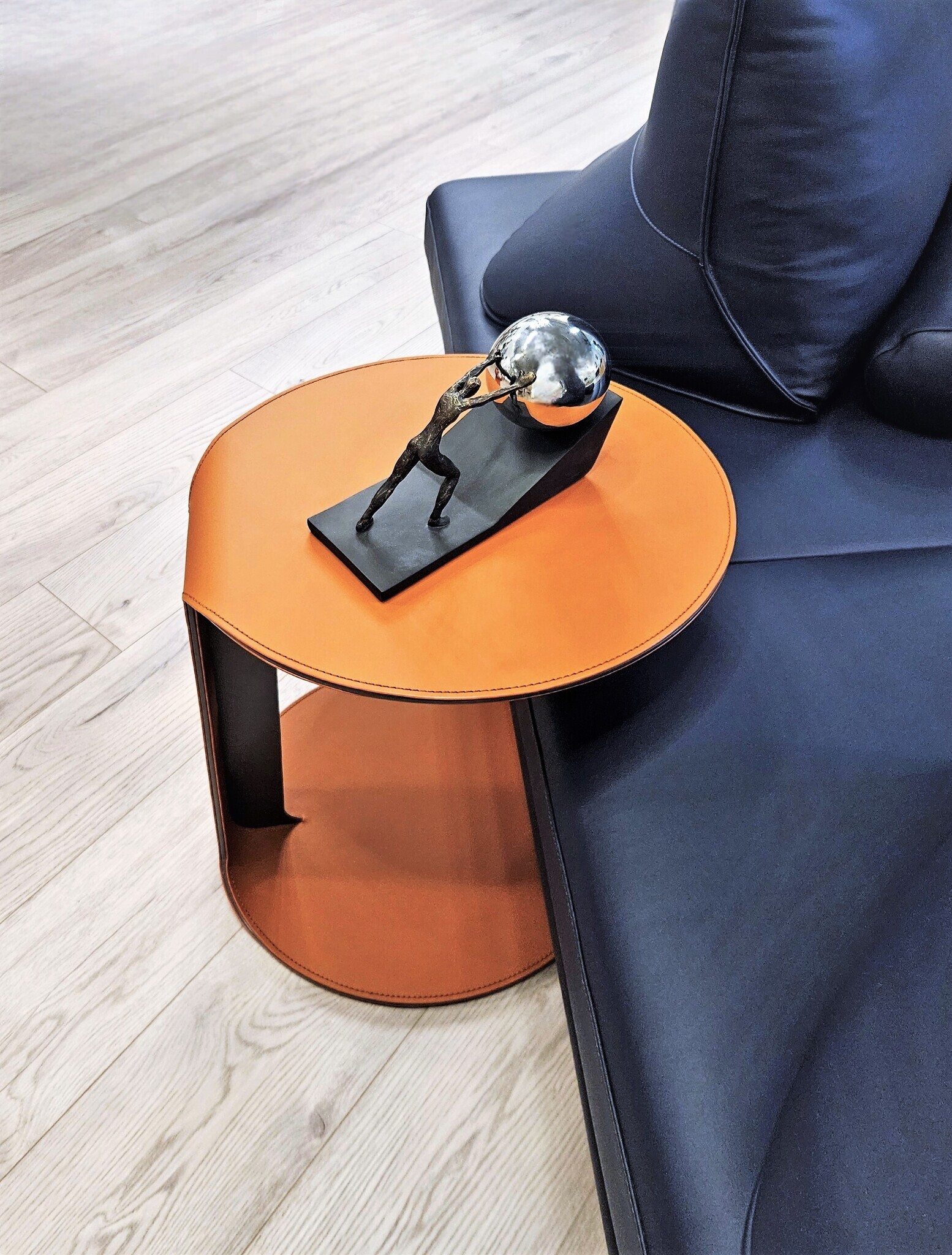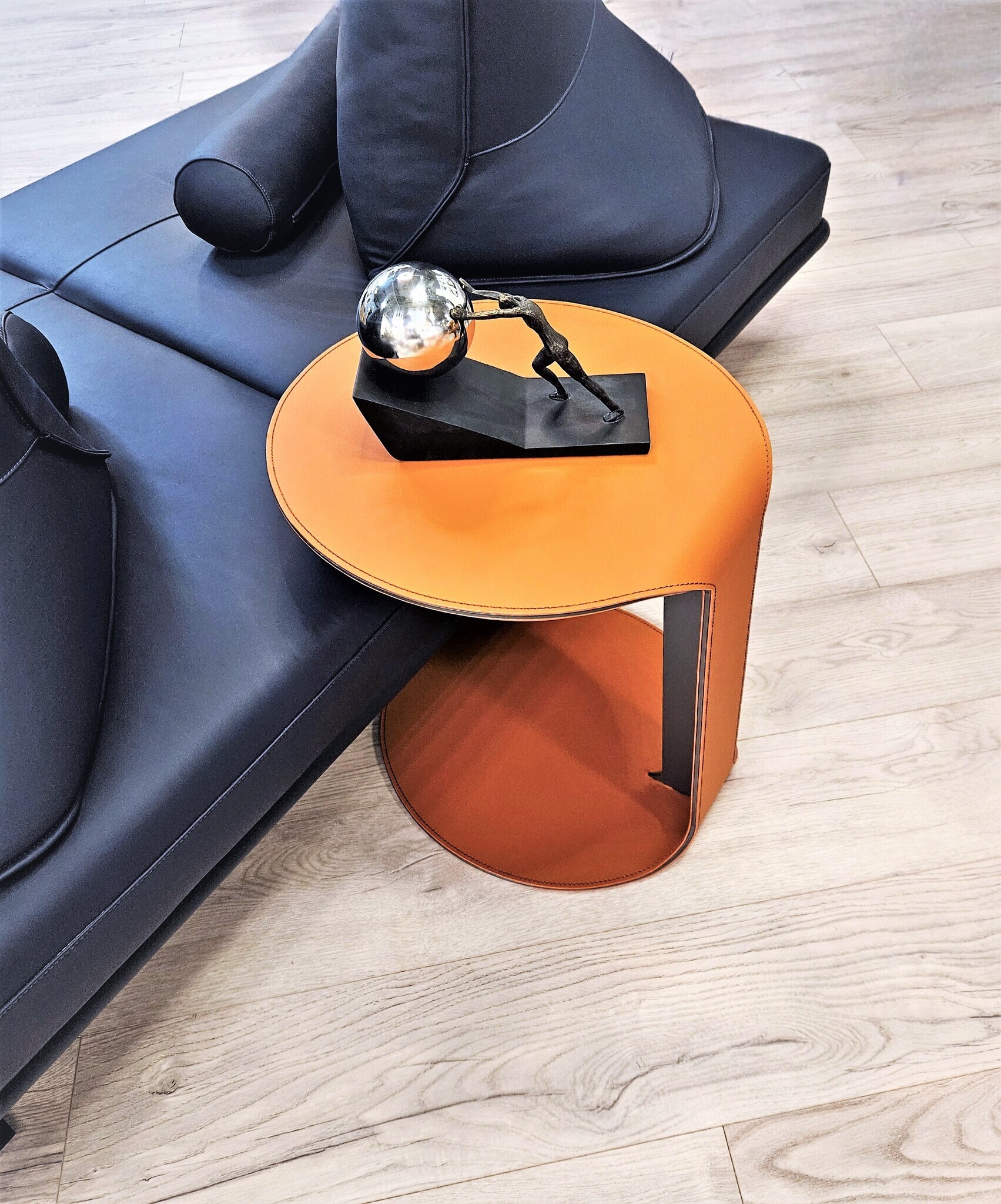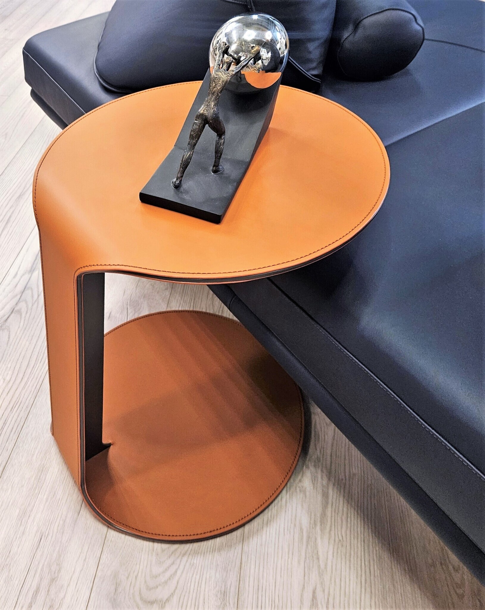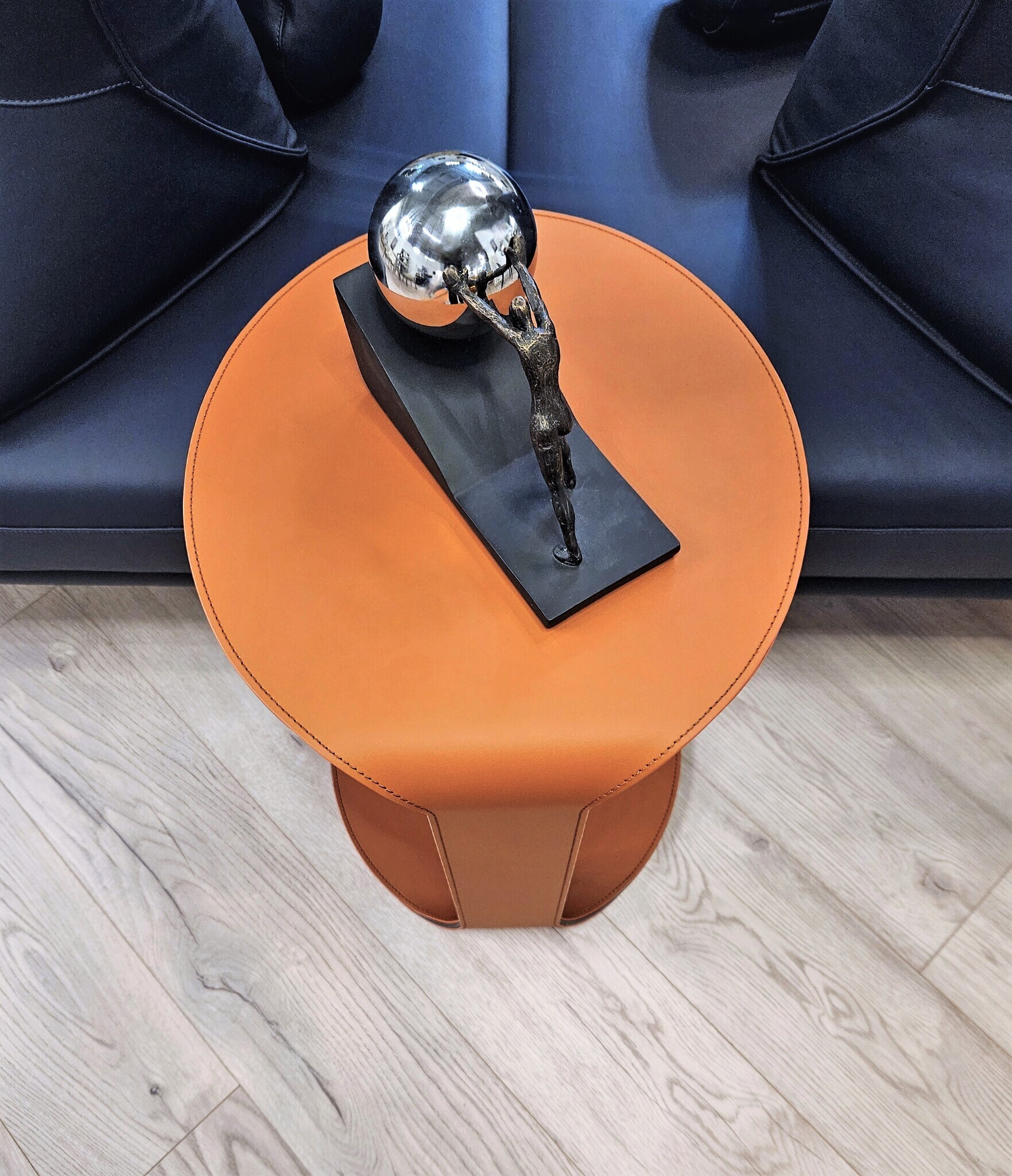 Основание выполнено из стали. Столешница: экокожа, металл. Цвет в наличии охра (рыжий). Поставляется в собранном виде.Размеры упаковка, Д*Ш*В:50*50*54 см, вес 12 кг.