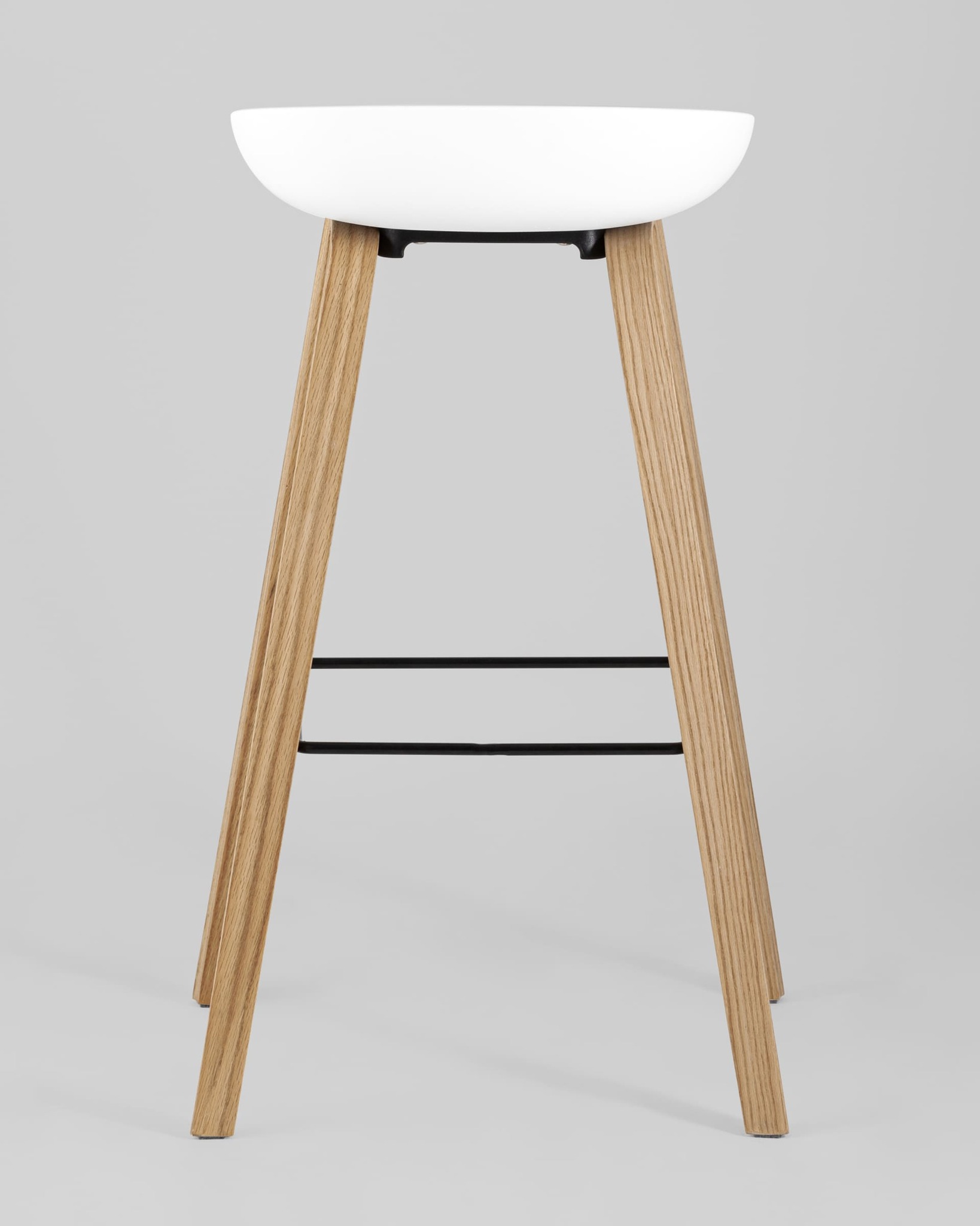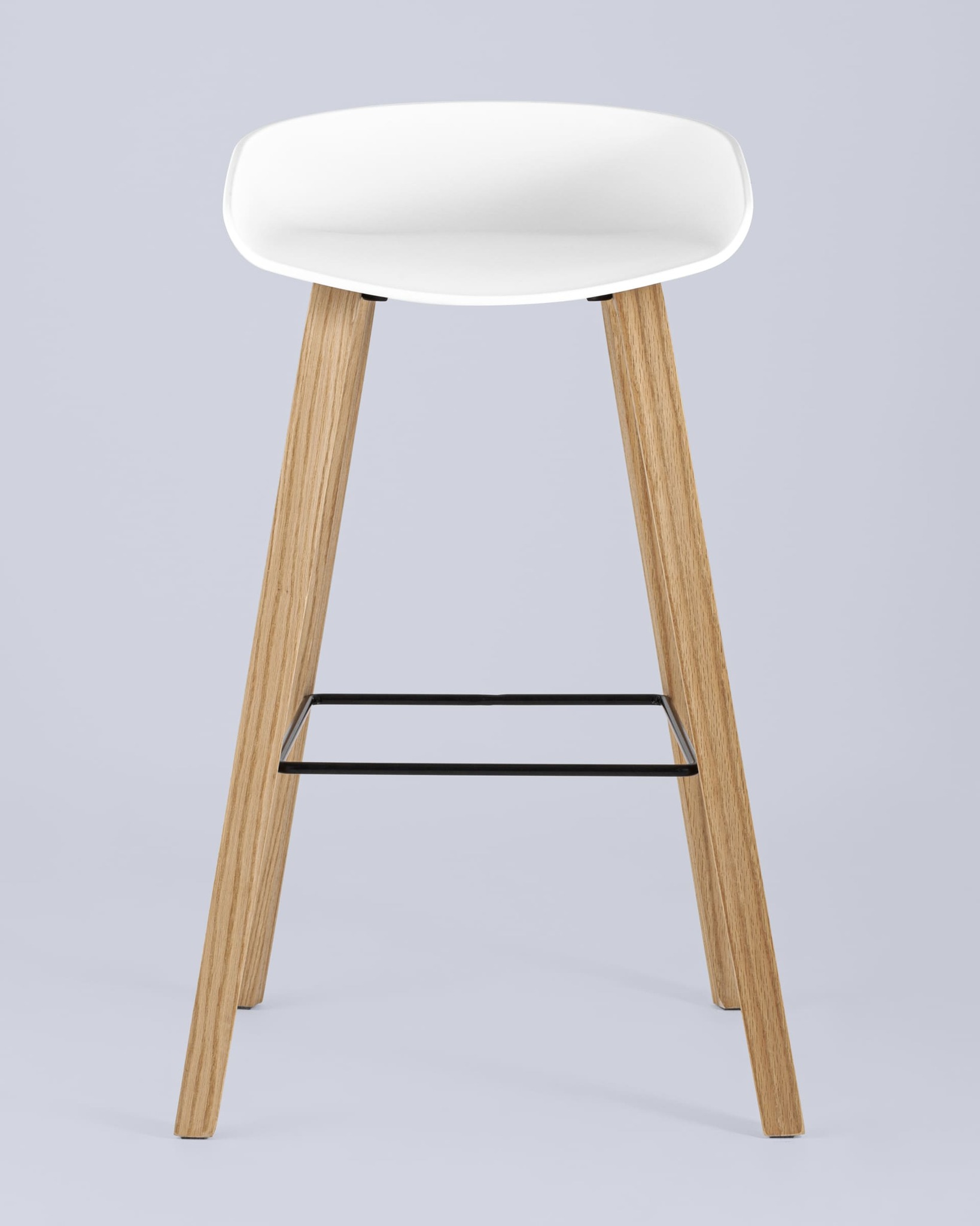 В дизайне модели «Либра» используется сочетание белого пластика и естественного оттенка натурального дерева – опоясывающая ножки опорная планка в тон сиденью уравновешивает цветовую комбинацию и подчеркивает модные геометрические формы барного стула. Высота соответствует стойке стандартной высоты.