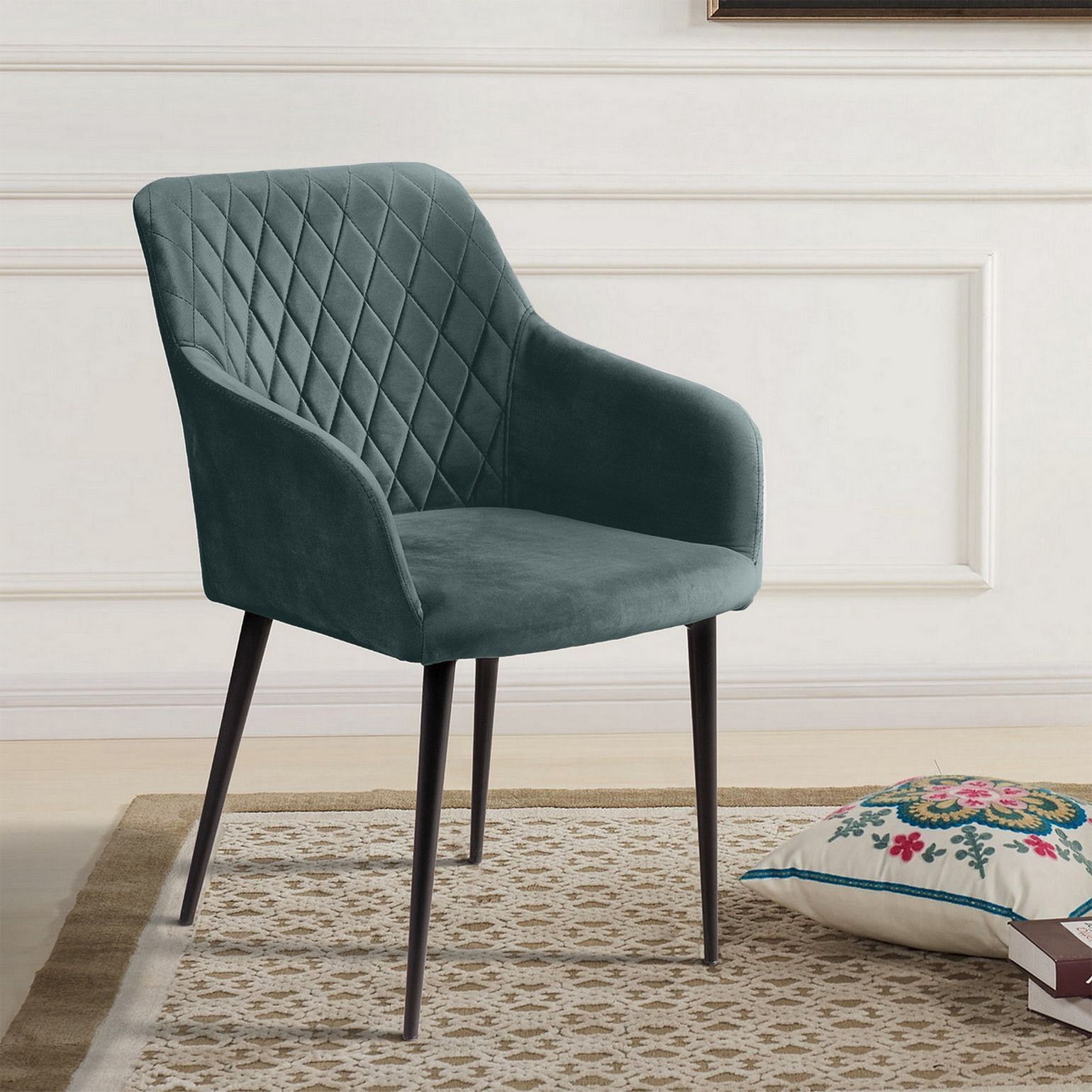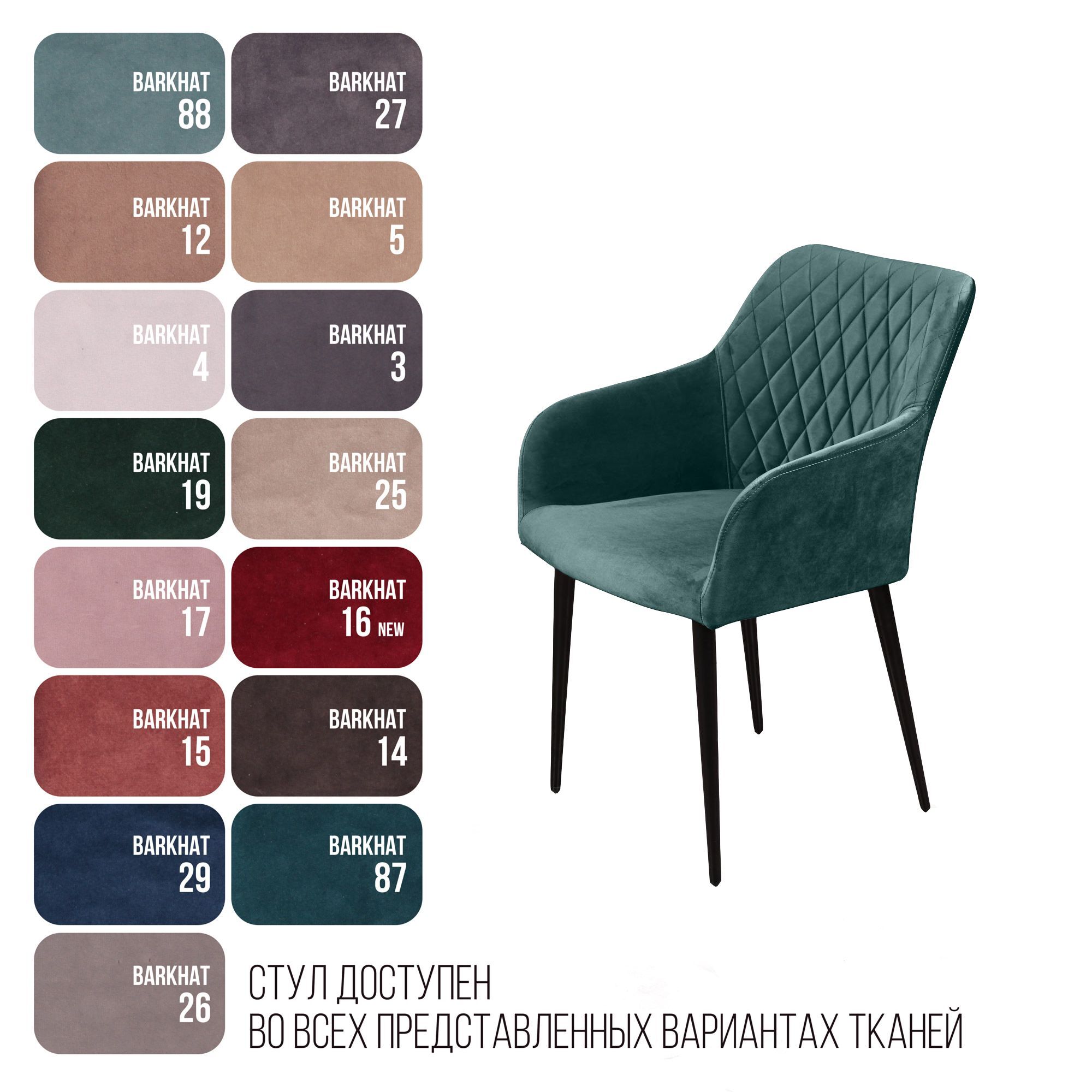 strong*Оттенок может выглядеть по-разному в зависимости от направления ворса./strong Роскошный и уютный стул в стиле арт-деко. Смотрится дорого, стильно и эффектно. Он создан, чтобы очаровывать с первого взгляда. Плавные линии, изящные ножки, просторное сиденье и высокие подлокотники делают модель невероятно удобной для отдыха. Стильная отделка ромбом на спинке и сиденье в сочетании с благородным бархатом создает неповторимые переливы и придает стулу особую утонченность. Обивка Мягкий бархатистый велюр, высококачественный материал с повышенной износостойкостью. Он прост в уходе и не потеряет достойный вид долгое время. Ткань прочная, специально предназначена для ежедневного использования дома или в заведениях общественного типа (кафе, рестораны). Наполнитель В качестве наполнителя используется литой (формованный) пенополиуретан высокой плотности. Даже при длительном использовании он не теряет форму и не деформируется. Такое наполнение гарантирует долгий срок службы изделия, что особенно важно для коммерческого использования (при эксплуатации в сегменте HоReCa). Ножки Изюминка стула Robert – металлические ножки черного матового цвета (могут быть белыми), излишне скошенные назад, как часть дизайнерской задумки. На ножках предусмотрены специальные пластиковые накладки, которые придают стулу дополнительную устойчивость и защищают пол от царапин. Гарантия Тщательная проверка качества изделий осуществляется на всех этапах производства: от подбора материалов и комплектующих до проверки готового изделия перед отправкой. На все изделия Top concept мы предоставляем гарантию 18 месяцев.